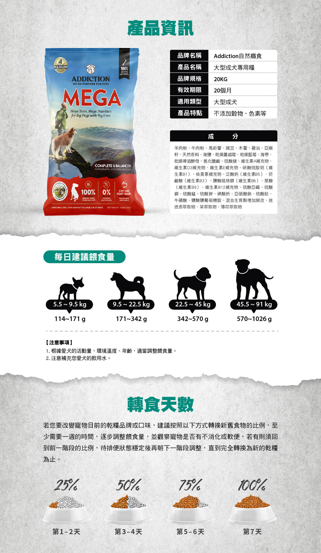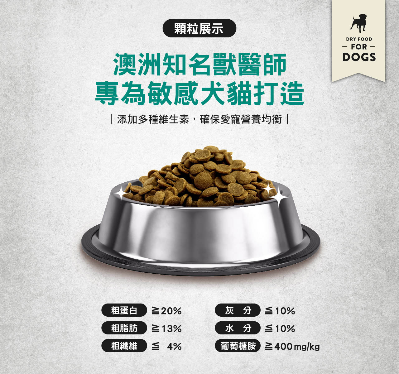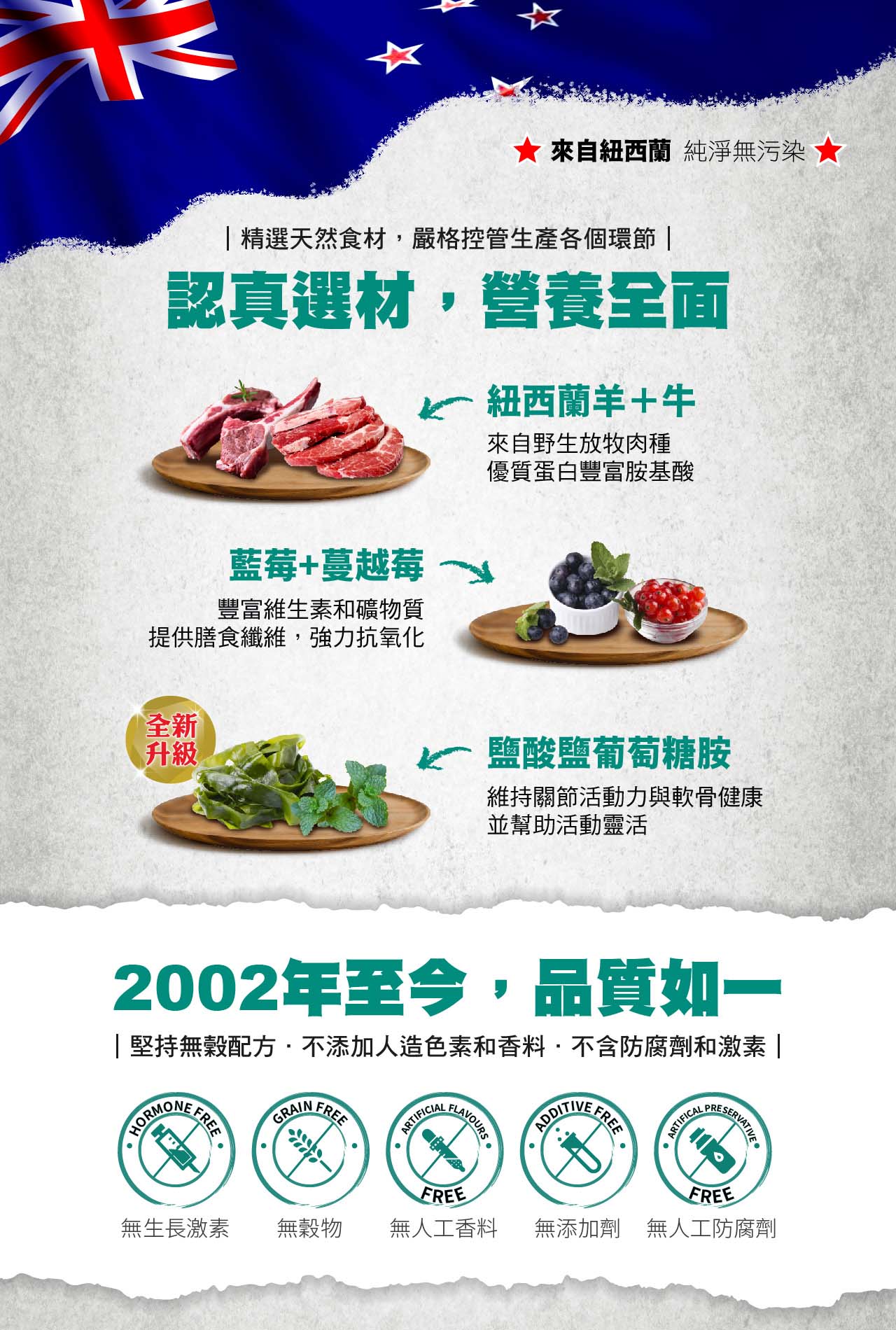 成分:羊肉粉、牛肉粉、馬鈴薯、豌豆、木薯、雞油、亞麻籽、天然香料、海鹽、乾燥蔓越莓、乾燥藍莓、海帶、乾燥啤酒酵母、