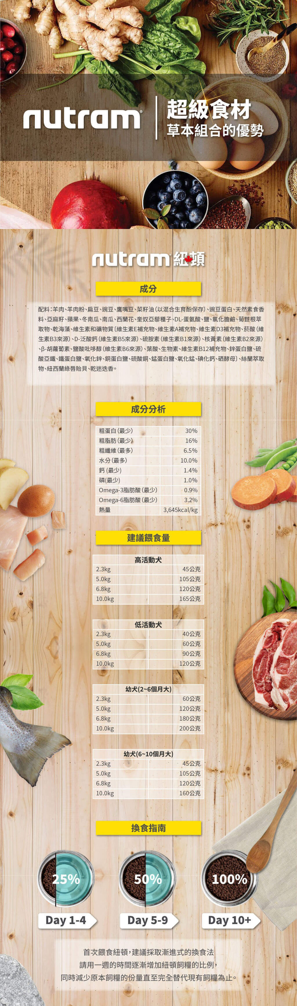 羊肉、羊肉粉、扁豆、豌豆、鷹嘴豆、菜籽油(以混合生育酚保存)、豌豆蛋白、天然素食香料、亞麻籽、蘋果、冬南瓜、南瓜、西蘭花、奎奴亞藜種子、DL-蛋氨酸、鹽、氯化膽鹼、菊苣根萃取物、乾海藻、維生素和礦物質〔維生素E補充物、維生素A補充物、維生素D3補充物、菸酸(維生素B3來源)、D-泛酸鈣(維生素B5來源)、硫胺素(維生素B1來源)、核黃素(維生素B2來源)、β-胡蘿蔔素、鹽酸吡哆醇(維生素B6來源)、葉酸、生物素、維生素B12補充物、鋅蛋白鹽、硫酸亞鐵、鐵蛋白鹽、氧化鋅、銅蛋白鹽、硫酸銅、錳蛋白鹽、氧化錳、碘化鈣、硒酵母〕、絲蘭萃取物、紐西蘭綠唇貽貝、乾迷迭香
