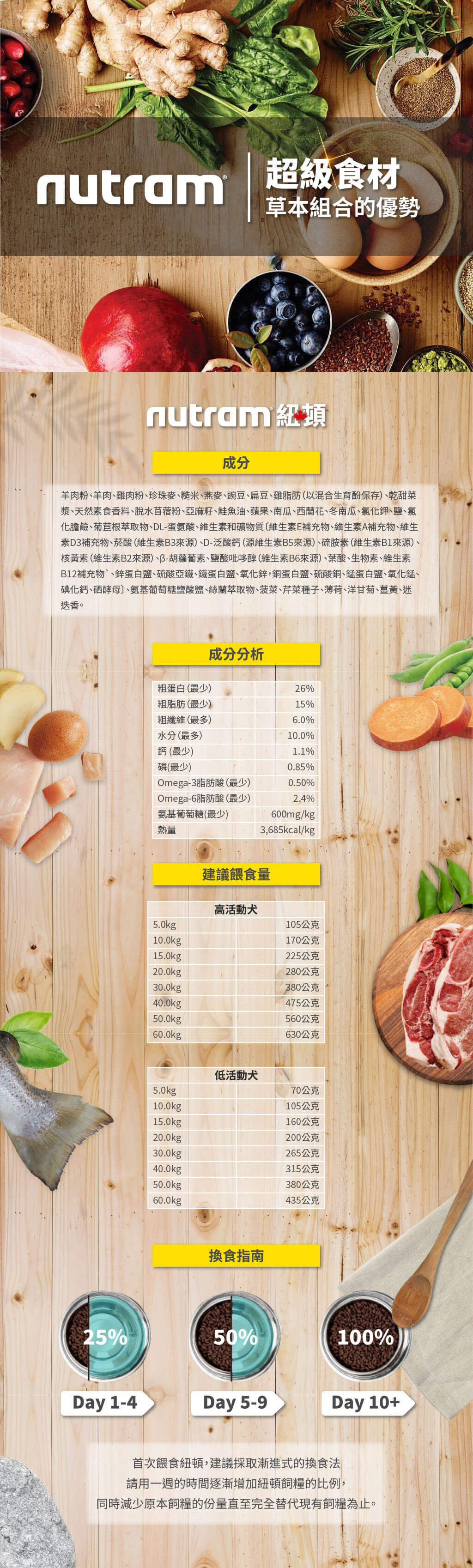 羊肉粉、羊肉、雞肉粉、珍珠麥、糙米、燕麥、豌豆、扁豆、雞脂肪(以混合生育酚保存)、乾甜菜漿、天然素食香料、脫水苜蓿粉、亞麻籽、鮭魚油、蘋果、南瓜、西蘭花、冬南瓜、氯化鉀、鹽、氯化膽鹼、菊苣根萃取物、DL-蛋氨酸、維生素和礦物質〔維生素E補充物、維生素A補充物、維生素D3補充物、菸酸(維生素B3來源)、D-泛酸鈣(源維生素B5來源)、硫胺素(維生素B1來源)、核黃素(維生素B2來源)、β-胡蘿蔔素、鹽酸?哆醇(維生素B6來源)、葉酸、生物素、維生素B12補充物`、鋅蛋白鹽、硫酸亞鐵、鐵蛋白鹽、氧化鋅,銅蛋白鹽、硫酸銅、錳蛋白鹽、氧化錳、碘化鈣、硒酵母〕、氨基葡萄糖鹽酸鹽、絲蘭萃取物、菠菜、芹菜種子、薄荷、洋甘菊、薑黃、迷迭香