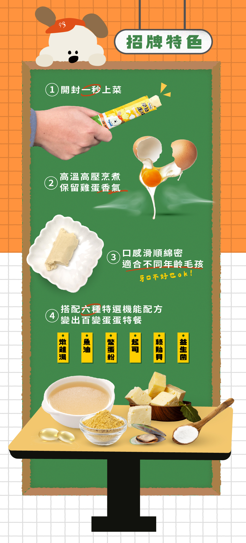 【成分】:熬煮雞湯、雞蛋、雞濃白湯、雞油、蛋黃粉、乳清粉、增稠劑、魚水解蛋白、魚油、碘鹽、乳化劑