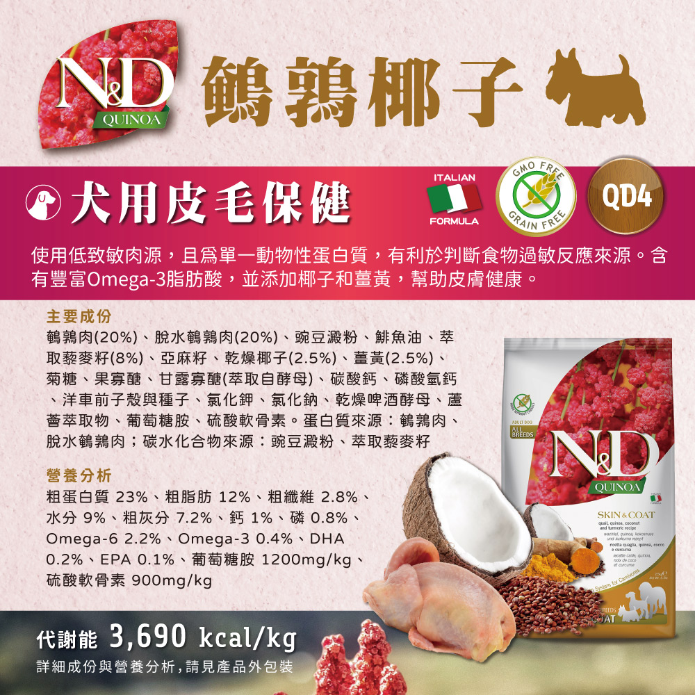 法米納 無穀犬飼料 Farmina 天然藜麥無穀機能系列-挑嘴犬用 QD-4 皮毛保健 鵪鶉椰子 2.5KG