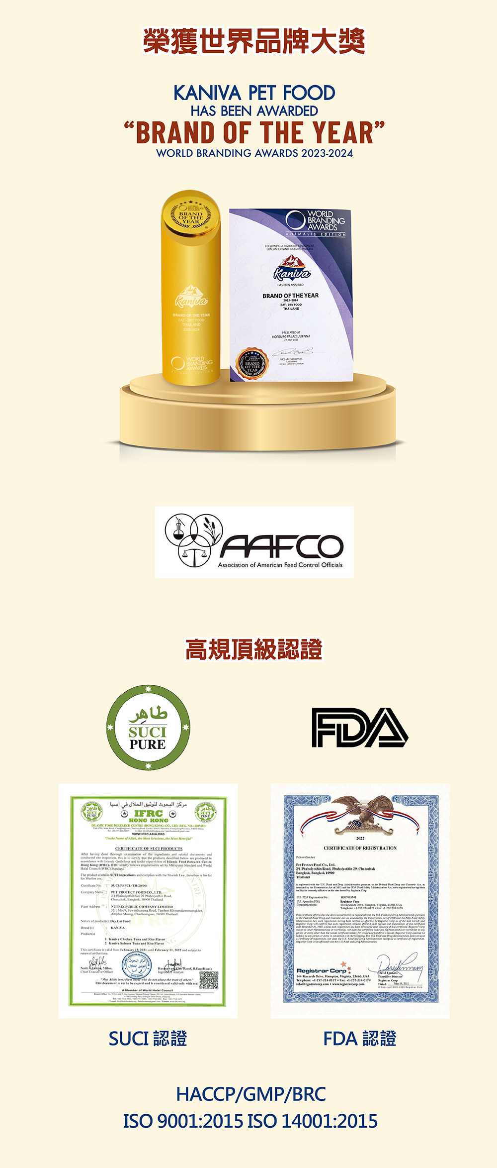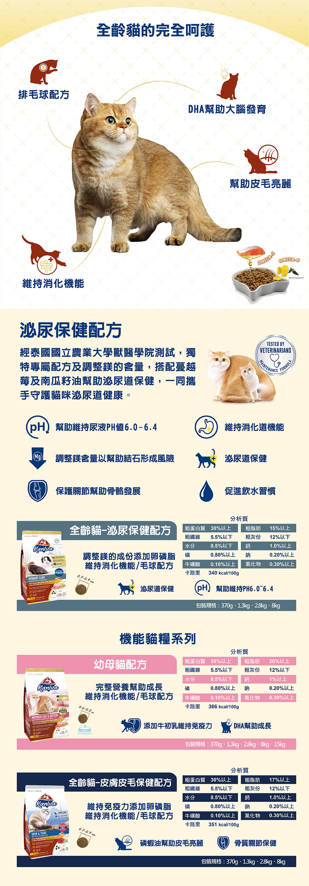 粗蛋白質30%以上、粗脂肪17%以上、粗纖維5.5%以下、粗灰份12%以下、水份8.5%以下、鈣1%以上、磷0.80%以上、鈉0.20%以上、氯化物0.30%以上、牛磺酸0.10%以上