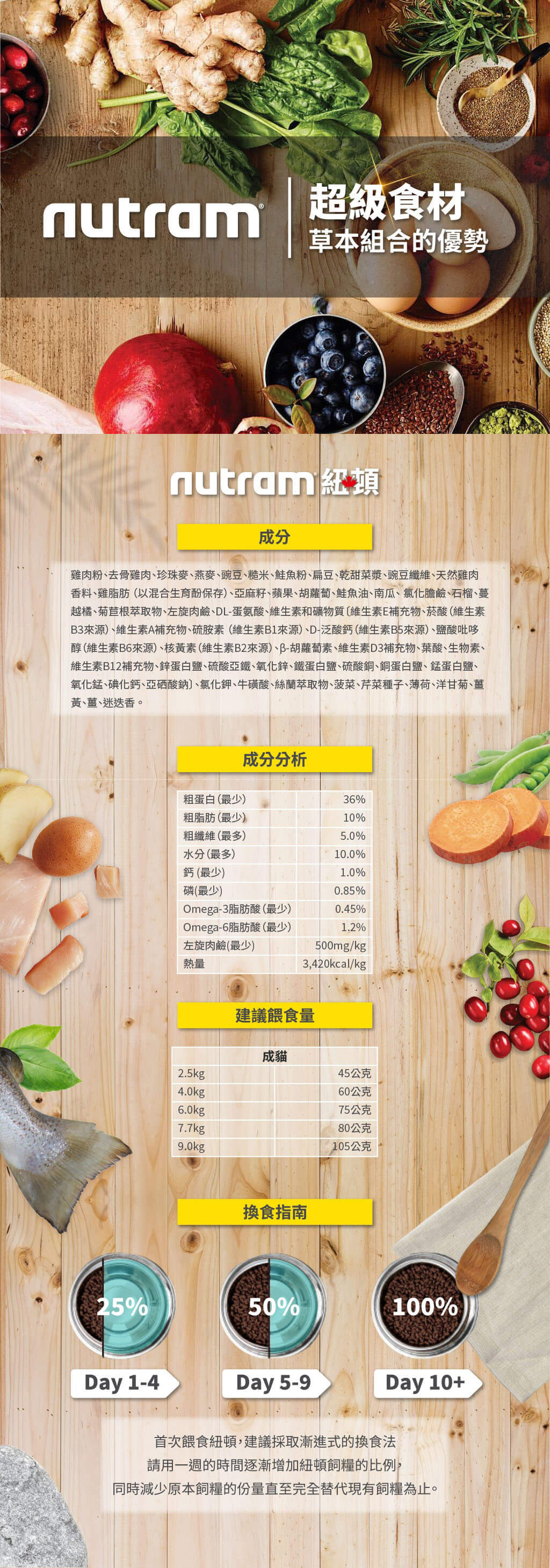 雞肉粉、去骨雞肉、珍珠麥、燕麥、豌豆、糙米、鮭魚粉、扁豆、乾甜菜漿、豌豆纖維、天然雞肉香料、雞脂肪 (以混合生育酚保存)、亞麻籽、蘋果、胡蘿蔔、鮭魚油、南瓜、 氯化膽鹼、石榴、蔓越橘、菊苣根萃取物、左旋肉鹼、DL-蛋氨酸、維生素和礦物質〔維生素E補充物、菸酸(維生素B3來源)、維生素A補充物、硫胺素 (維生素B1來源)、D-泛酸鈣(維生素B5來源)、鹽酸?哆醇(維生素B6來源)、核黃素(維生素B2來源)、β-胡蘿蔔素、維生素D3補充物、葉酸、生物素、維生素B12補充物、鋅蛋白鹽、硫酸亞鐵、氧化鋅、鐵蛋白鹽、硫酸銅、銅蛋白鹽、 錳蛋白鹽、氧化錳、碘化鈣、亞硒酸鈉〕、氯化鉀、牛磺酸、絲蘭萃取物、菠菜、芹菜種子、薄荷、洋甘菊、薑黃、薑、迷迭香 。
