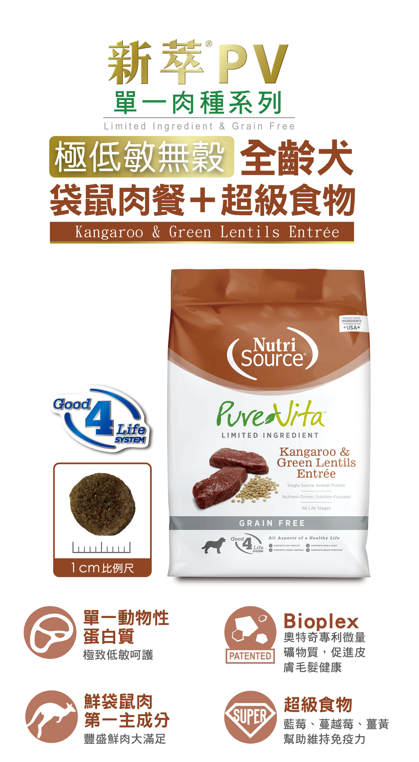 Nutri Source 新萃 PV 單一肉種系列 - 極低敏無穀全齡犬 袋鼠肉餐+超級食物 狗飼料
