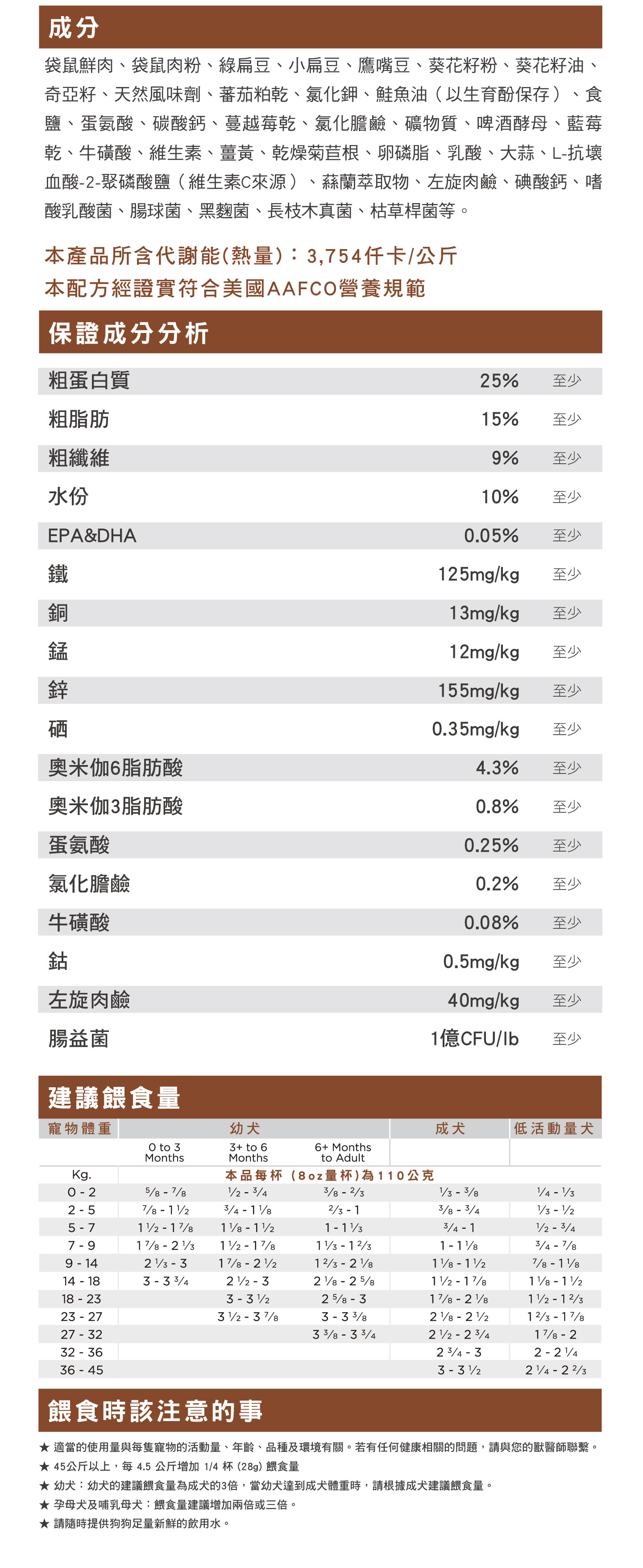 袋鼠鮮肉、袋鼠肉粉、綠扁豆、小扁豆、鷹嘴豆、葵花籽粉、葵花籽油、