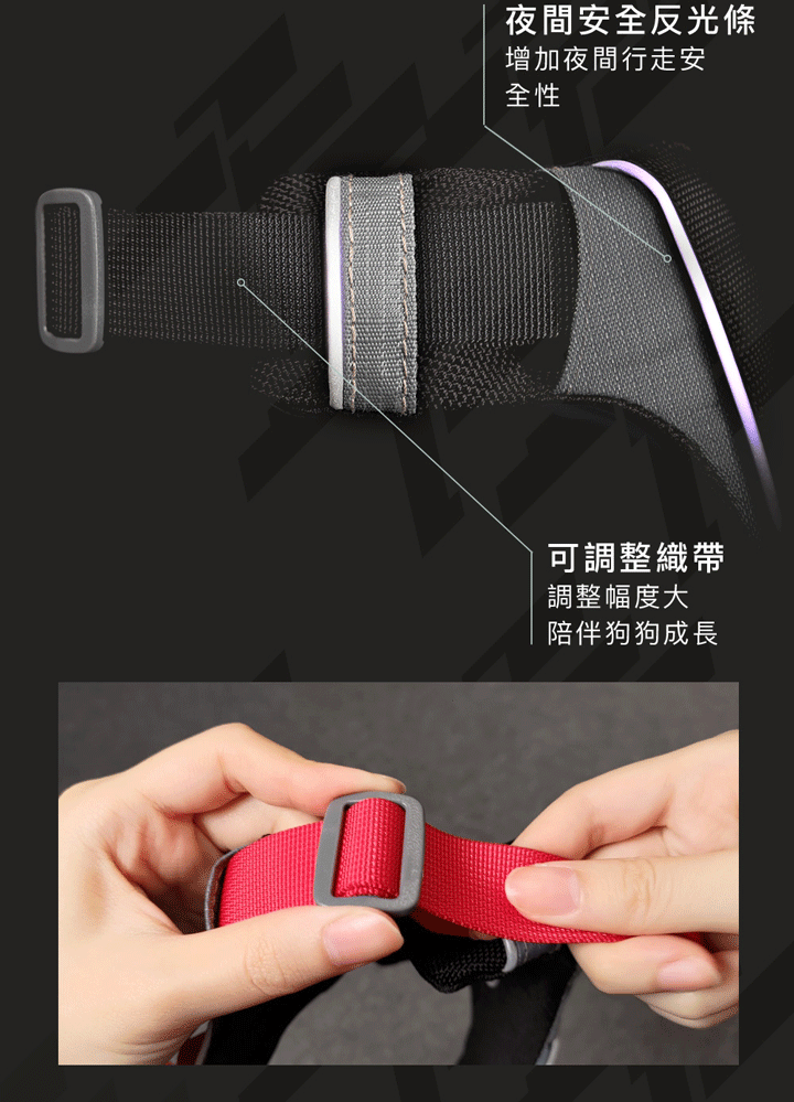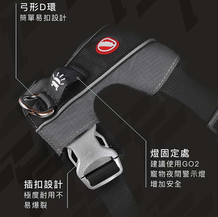 胸背上有做反光跳設計也可以扣上夜間LED警示燈保障夜間外出安全。