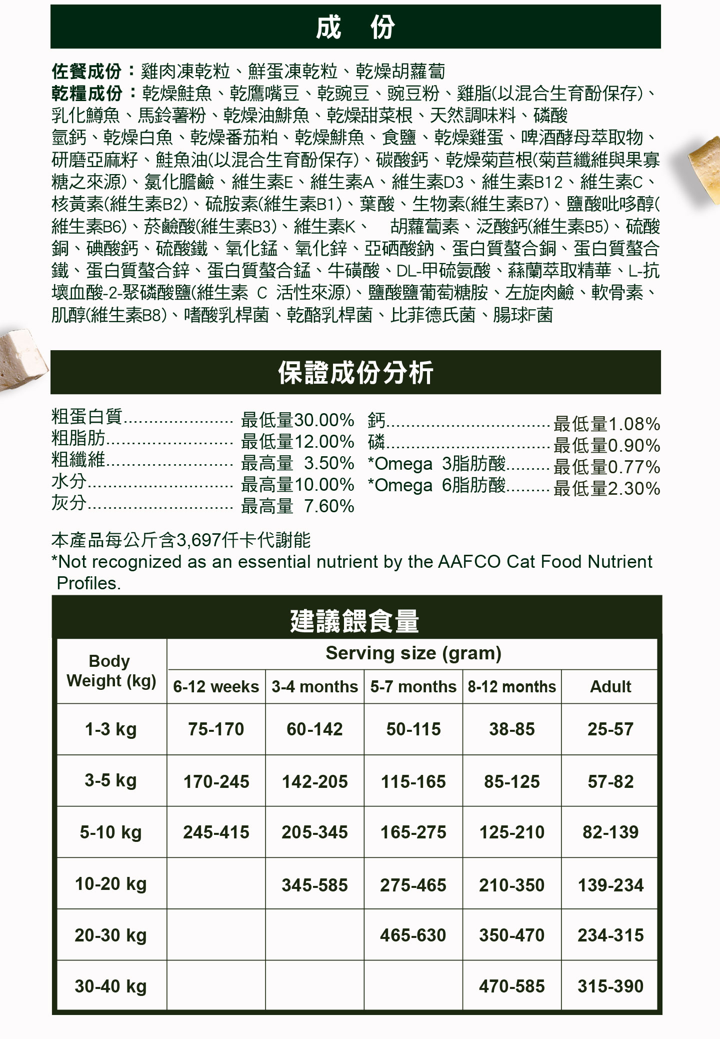 乾燥鮭魚、乾鷹嘴豆、乾豌豆、豌豆粉、雞脂(以混合生育酚保存)、乳化鱒魚、馬鈴薯粉、乾燥油鯡魚、乾燥甜菜根、天然調味料、磷酸 氫鈣、乾燥白魚、乾燥番茄粕、乾燥鯡魚、食鹽、乾燥雞蛋、啤酒酵母萃取物、研磨亞麻籽、鮭魚油(以混合生育酚保存)、碳酸鈣、乾燥菊苣根(菊苣纖維與果寡糖之來源)、氯化膽鹼、維生素E、維生素A、維生素D3、維生素B12、維生素C、核黃素(維生素B2)、硫胺素(維生素B1)、葉酸、生物素(維生素B7)、鹽酸吡哆醇(維生素B6)、菸鹼酸(維生素B3)、維生素K、 胡蘿蔔素、泛酸鈣(維生素B5)、硫酸銅、碘酸鈣、硫酸鐵、氧化錳、氧化鋅、亞硒酸鈉、蛋白質螯合銅、蛋白質螯合鐵、蛋白質螯合鋅、蛋白質螯合錳、牛磺酸、DL-甲硫氨酸、蕬蘭萃取精華、L-抗壞血酸-2-聚磷酸鹽(維生素 C 活性來源)、鹽酸鹽葡萄糖胺、左旋肉鹼、軟骨素、肌醇(維生素B8)、嗜酸乳桿菌、乾酪乳桿菌、比菲德氏菌、腸球F菌