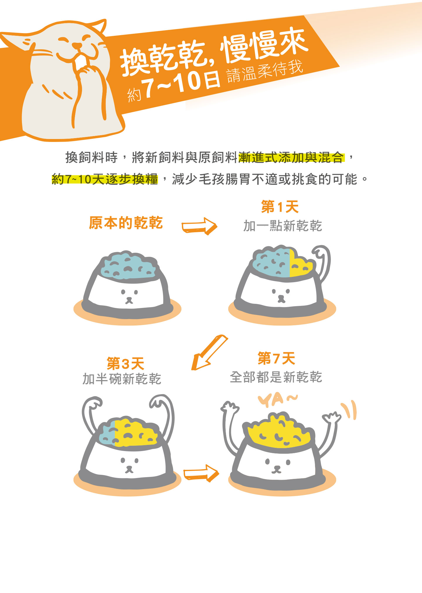 注意事項:換新飼料時,將新飼料與舊飼料漸進式混合增加,以7-10天轉換為新飼料