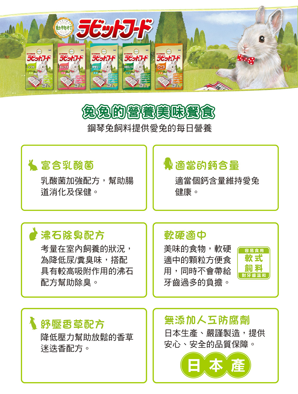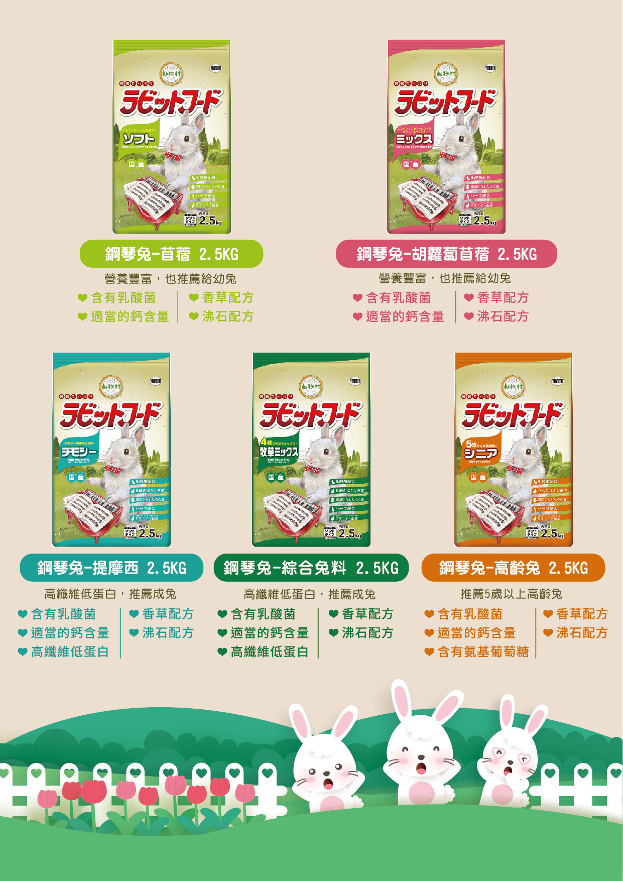 成分 : 草(苜蓿,蘇丹草,仙鶴草,狗牙根),玉米,玉米蛋白飼料,麥麩,脫脂大豆,小麥粉,乾豆渣,沸石,葡萄糖,滅菌型乳酸菌,迷迭香,礦物質(鹽,碳酸)鈣,硫酸鋅,硫酸銅,硫酸鈷,碘酸鈣),氨基酸(DL-蛋氨酸),維生素(B3,膽鹼,B6,E,B5,A,B2,葉酸H,D3)